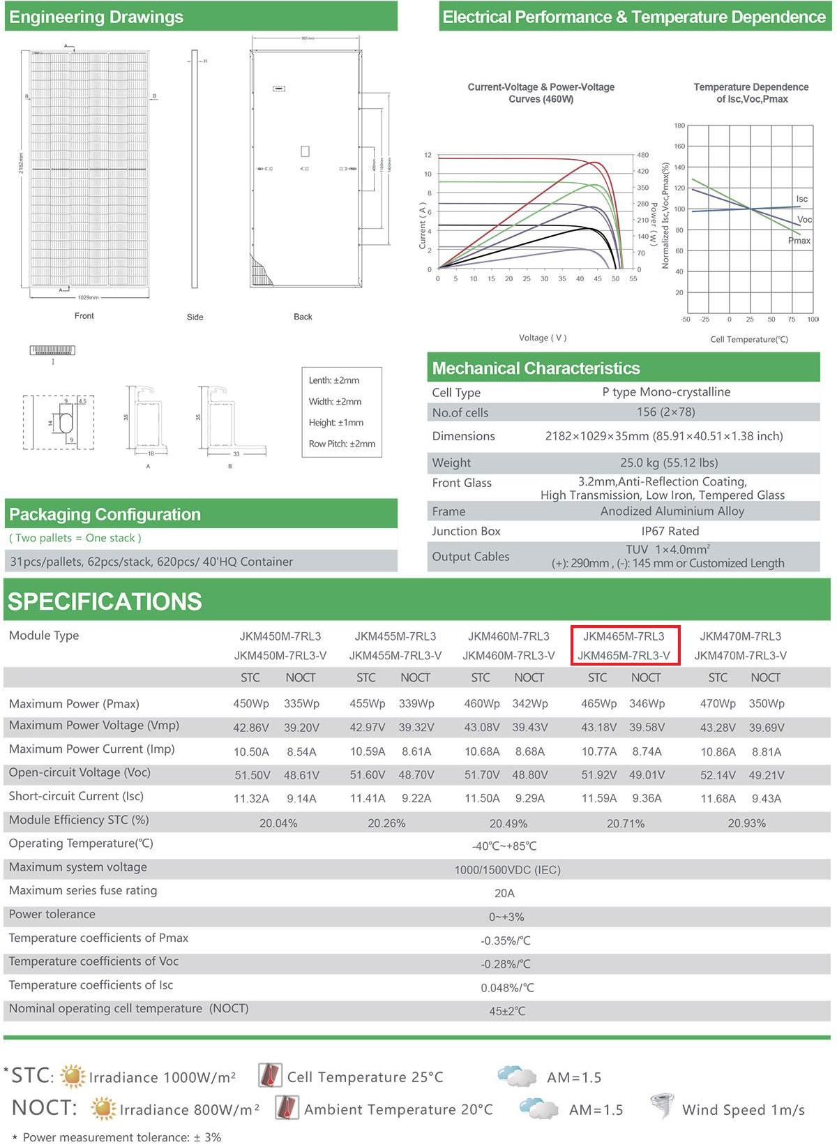 JKM465M-7RL3-V 465W có dung sai hiệu suất dương (0 ~ +3%), có nghĩa là sẽ luôn có công suất định mức tối đa STC lớn hơn hoặc bằng giá trị thông số kỹ thuật (tối đa 478.95W)